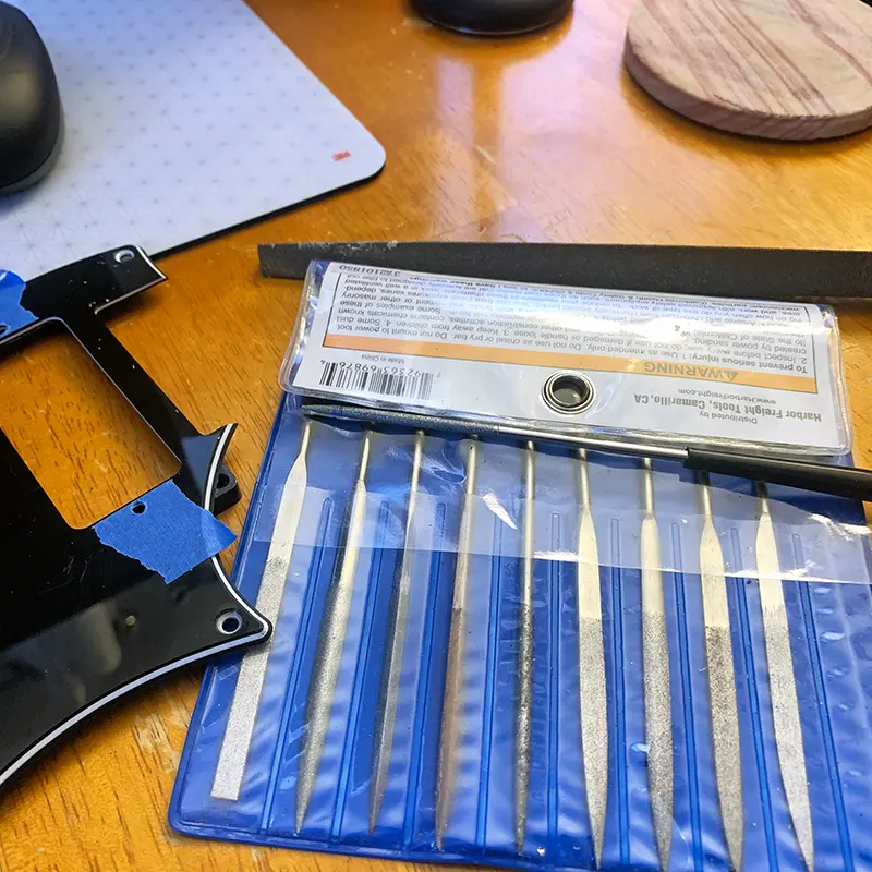 Here's a picture of the files I used. First thing, take the paint pin and paint the back of the pickguard around the minihumbucker. It will make it easier to see what material you need to file away. I used a water based paint so it would come off easily.